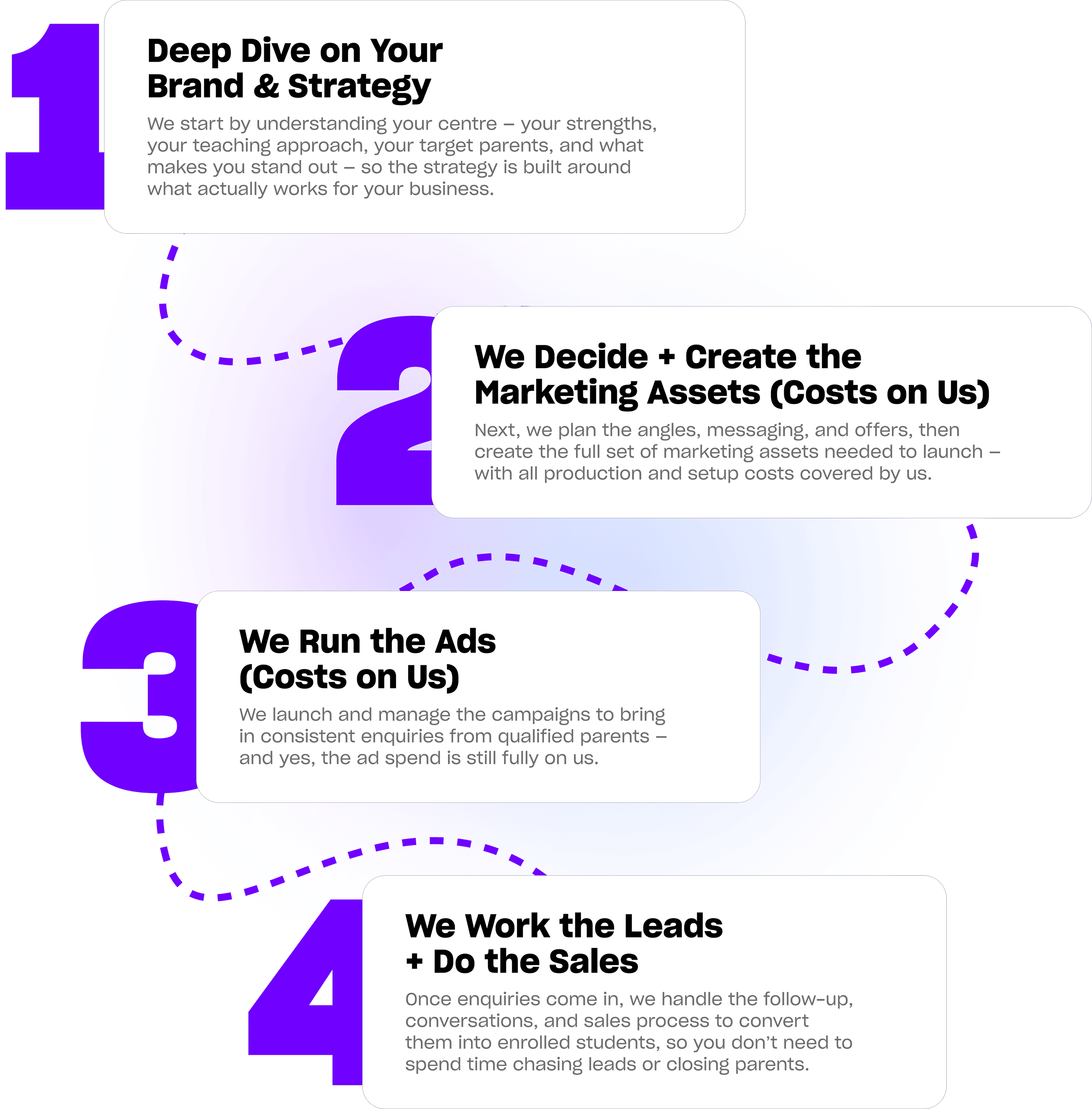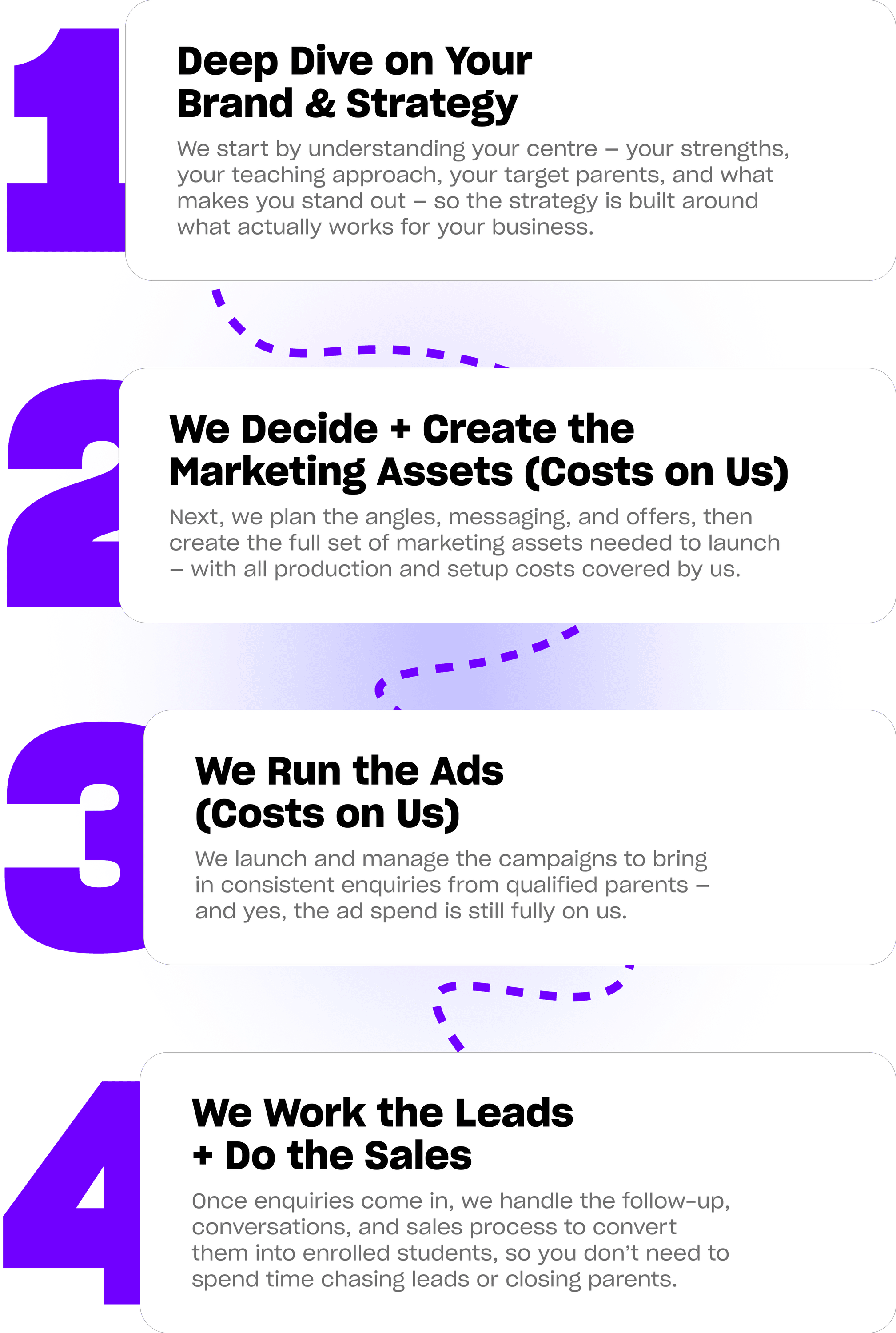 We start by understanding your centre — your strengths, your teaching approach, your target parents, and what makes you stand out — so the strategy is built around what actually works for your business.
